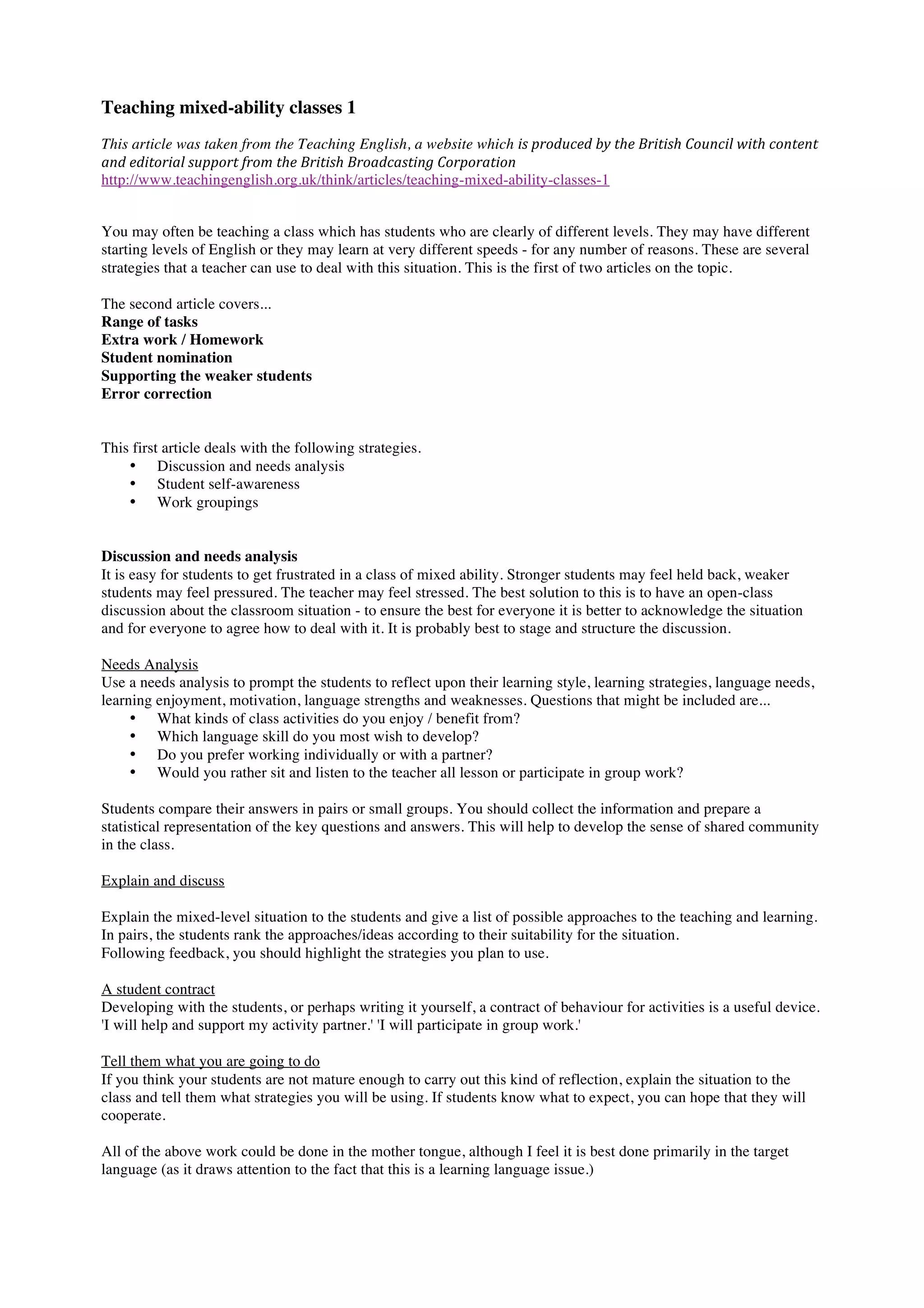 The document discusses strategies for teaching mixed-ability English language classes. It recommends having an open discussion with students about the range of abilities in the class. The teacher should also do a needs analysis to understand students' learning styles and preferences. Students can be grouped in different ways for different activities, such as pairing strong students with weak students or grouping by similar ability levels. Mingles, where students interact briefly with many classmates, expose all students to a variety of ability levels. The goal is to create a positive environment where all students can learn effectively.