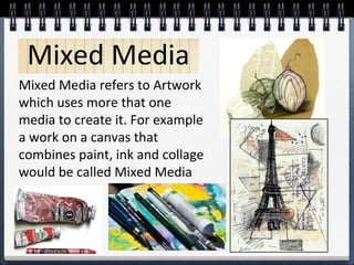 Mixed media refers to artwork created using more than one medium. For example, a work combining paint, ink, and collage on a canvas would be considered mixed media. This week, students are asked to create at least one large mixed media drawing considering shade and tone, complete a double page on a mixed media artist in their sketchbook, and optionally do additional mixed media drawings exploring their chosen theme. They may also want to start taking photographs.