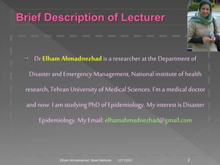 Dr. Elham Ahmadnezhad is a researcher studying disaster epidemiology at Tehran University of Medical Sciences. Her presentation discusses mixed methods research, including a brief history, why it is used, types of research designs, criteria for choosing strategies, data collection and analysis procedures, and report presentation structure. The document provides details on sequential, concurrent, and transformative mixed methods designs and discusses validation procedures and organizing findings in reports for different mixed methods approaches.