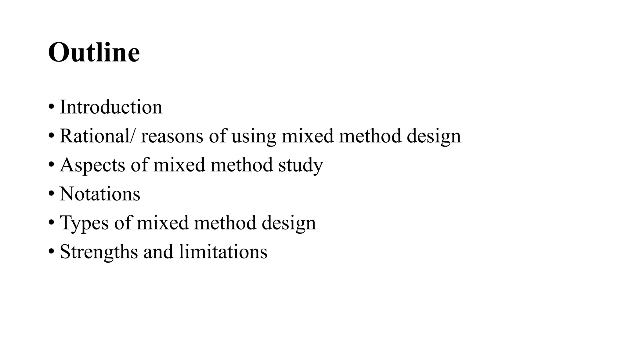 This document outlines different aspects of mixed method research design including definitions, types of designs, and strengths and limitations. It defines mixed methods as an approach that uses both quantitative and qualitative techniques. The main types of mixed method designs discussed are triangulation, embedded, explanatory, and exploratory designs. Triangulation design collects both quantitative and qualitative data concurrently to compare results. Embedded design has one data type play a supplemental role. Explanatory design starts with quantitative data collection and analysis followed by qualitative to explain results. Exploratory design starts with qualitative data to inform subsequent quantitative data collection. Strengths include using the advantages of both approaches while limitations include increased time and potential conflicting results.