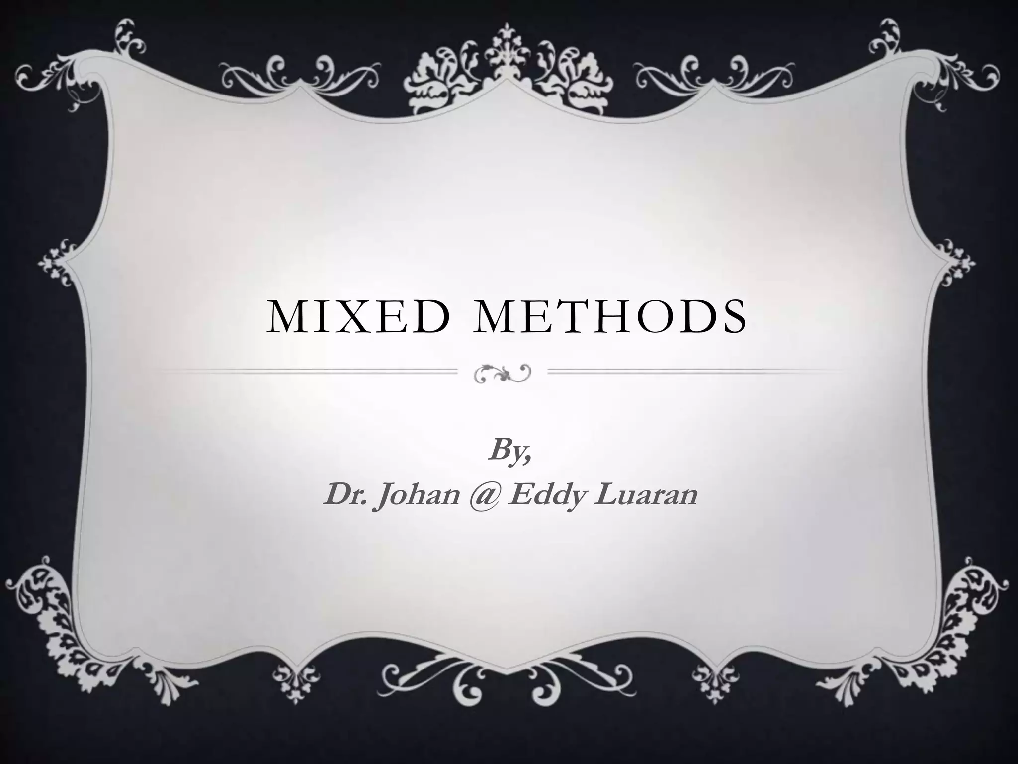 Mixed methods research combines quantitative and qualitative data collection and analysis in a single study. It allows researchers to gain a deeper understanding of a phenomenon by using the strengths of both quantitative and qualitative research. There are three main types of mixed methods designs: qualitative-quantitative, quantitative-qualitative, and concurrent quantitative-qualitative. Mixed methods research provides an opportunity for quantitative and qualitative data to inform and enhance each other.