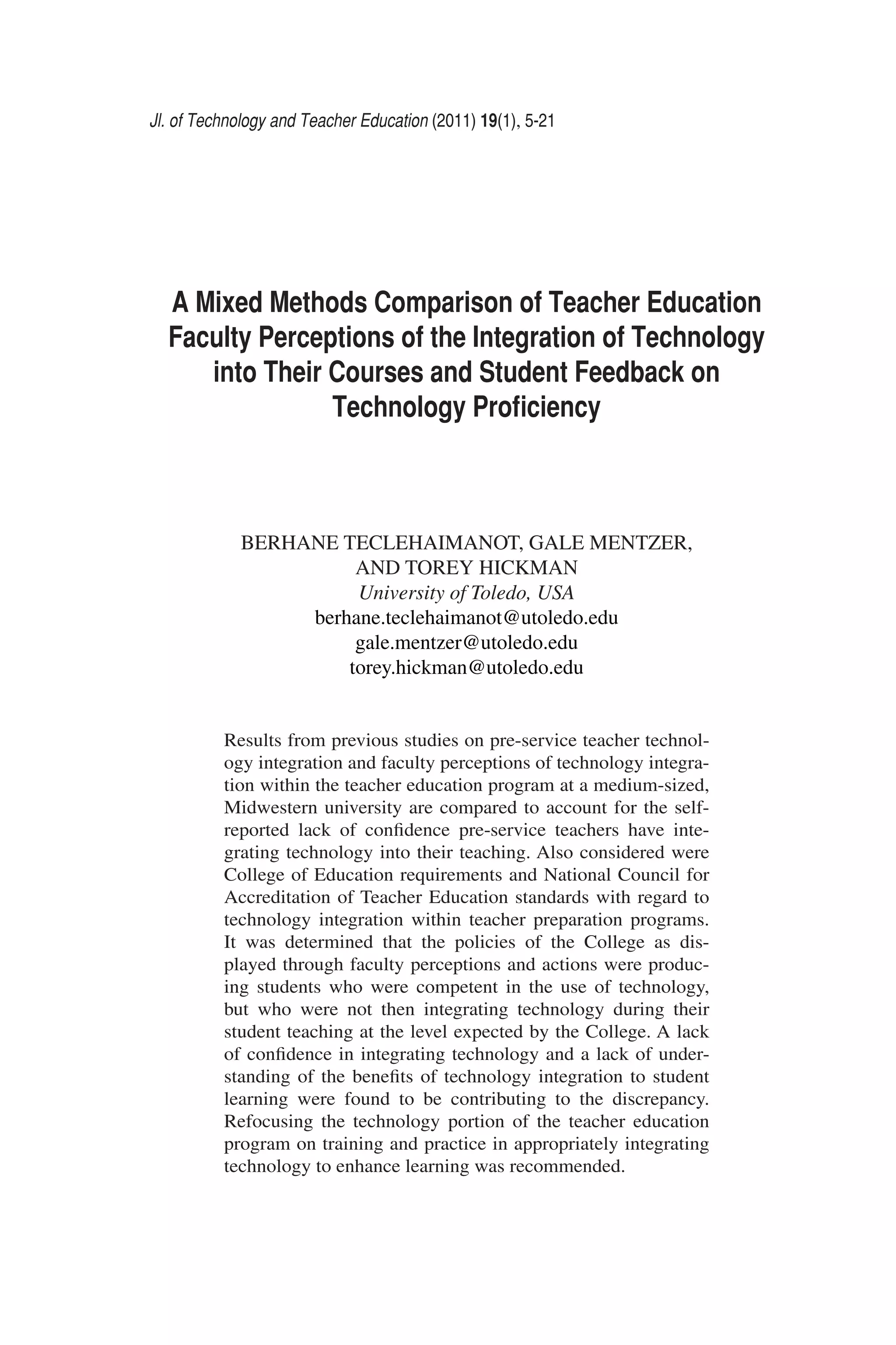 The document compares data from two previous studies: one on pre-service teachers' technology competence, confidence, and use during student teaching, and one on faculty perceptions of technology integration in their courses. While pre-service teachers received high grades in technology courses, their confidence in integrating technology was low. Student teaching portfolios also showed a lack of technology integration, despite self-reported planning. Faculty interviews revealed that while they saw value in technology, they did not consistently model integration or provide opportunities for students to practice it. This suggests a disconnect between faculty beliefs and actions that may explain students' lack of confidence and integration during student teaching.