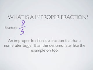 This document discusses improper fractions, mixed numbers, and how to convert between the two. It defines an improper fraction as having a numerator larger than the denominator, and a mixed number as a whole number combined with a proper fraction. It provides examples and step-by-step instructions for converting a mixed number to an improper fraction by multiplying, adding, and writing the result over the denominator, and converting an improper fraction to a mixed number by writing the whole number of times the denominator fits into the numerator and the remainder over the denominator.