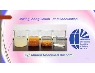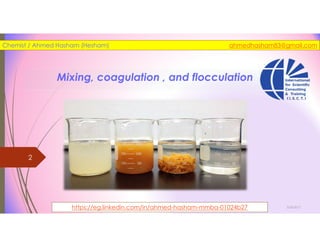 The document discusses the processes of mixing, coagulation, and flocculation in water treatment. It defines coagulation as destabilizing particles in water so they can attach to other particles and be removed. Flocculation is the formation of larger particles called flocs. Key factors that affect these processes are mixing conditions, pH, alkalinity, temperature, and turbidity. Common coagulant chemicals like alum and ferric salts are added for coagulation. Flocculation aids like polymers can help form stronger flocs. Proper process control includes monitoring these factors. Rapid mixing distributes coagulants uniformly while flocculation encourages floc formation.