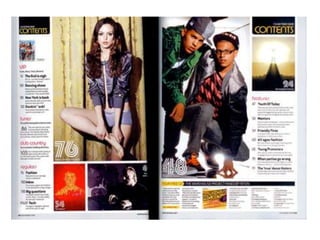 The document provides an analysis of the design elements of a dance music magazine cover and contents pages, including:
