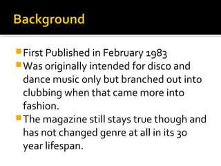 MixMag is a dance music magazine launched in 1983 that focuses on club culture. It began with a focus on disco and dance music but expanded to cover clubbing as that genre grew in popularity. While branching out, the magazine has stayed true to electronic music genres over its 30-year history. It maintains a consistent brand identity across issues through elements like a recurring skyline on the cover, a cover mount CD, and vibrant color schemes. The target audience is typically younger people between 16-30 interested in dance music and clubbing.