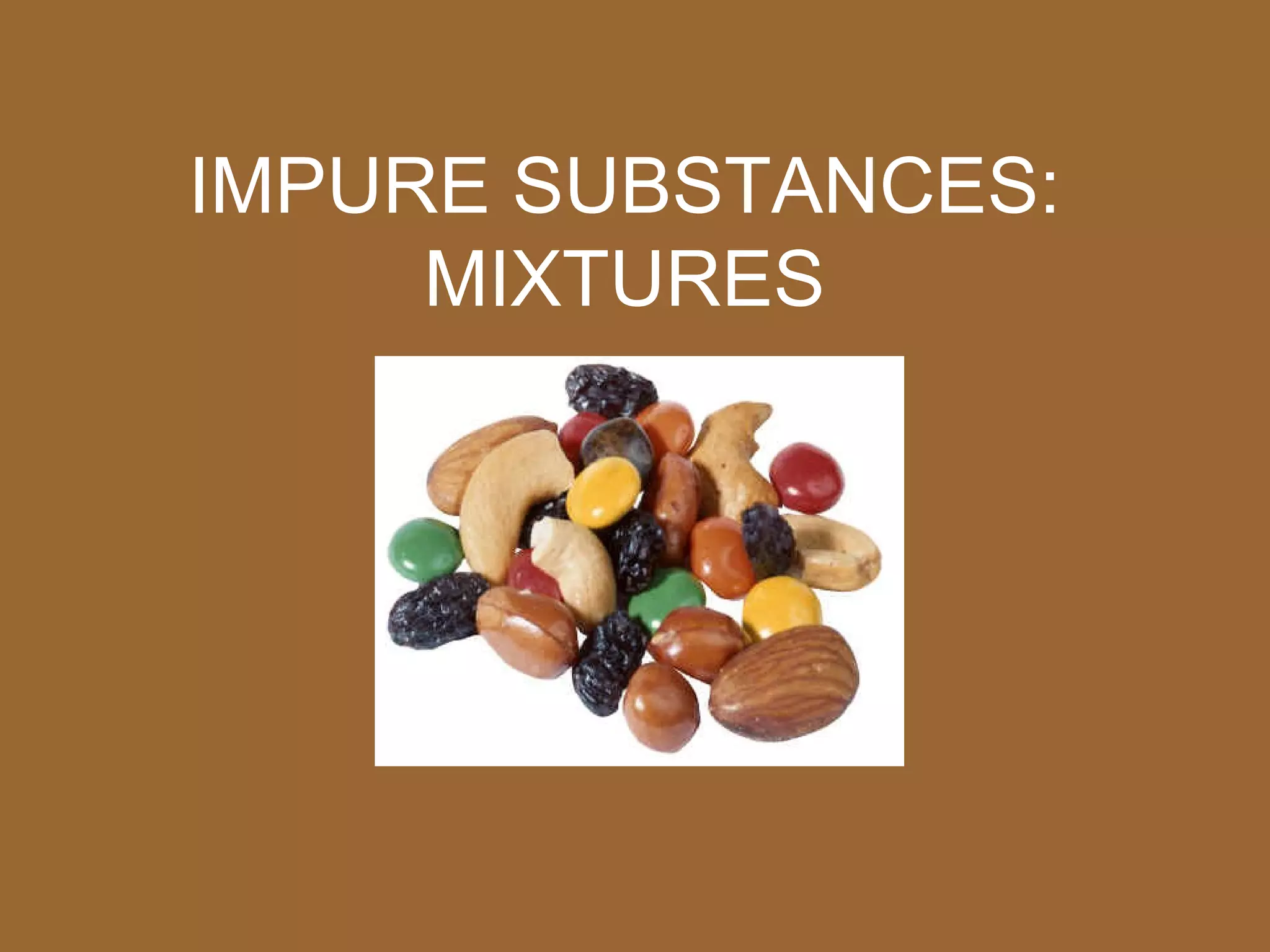 1. A mixture is a combination of two or more substances that are not chemically combined and where each substance retains its own chemical properties.