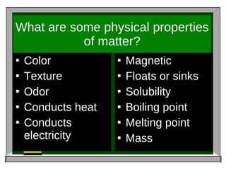 The document discusses physical properties of matter and mixtures. It provides examples of mixtures, such as salad and cereal, which maintain the physical properties of their ingredients. Solutions are described as a special type of mixture where one substance dissolves evenly in another. Common tools that can separate mixtures include filters, magnets, and evaporation.
