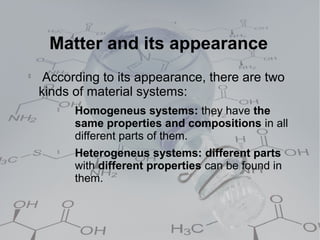 2. Homogeneous mixtures which are uniform throughout and can be either pure substances or solutions. Solutions contain a solute dissolved in a solvent.