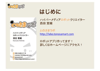 はじめに ハイパーメディアロボットクリエイター 西田 寛輔 とのさまラボ http://labo.tonosamart.com ロボットアプリ作ってます! 詳しくはホームページにアクセス!