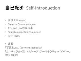 エイティブ・コモンズによる創造の循環』(フィルムアート社) • 田中浩也『FabLife』(オライリー・ジャパン) • 野口祐子『デジタル時代の著作権』(ちくま新書) • 坂井洋祐「インタラクションデザインにおけるオープン化事例の 検討」(hnp://www.slideshare.net/sakaiy/ss-‐14235100) • 池貝直人『情報社会と共同規制』(勁草書房) • 成原彗『情報社会における法とアーキテクチャの関係について の試論的考察』(東京大学大学院学際情報学部・情報学研究 No.81)(hnp://www.iii.u-‐tokyo.ac.jp/blog/media/ 7/20111019-‐81_5.pdf) • 川本大功「オープンデザインにおけるインセンティブ設計としての コモンズライセンスの提案〜Fab Commons〜」 (hnp://halu9.com/file/fabcommonsv1.pdf)