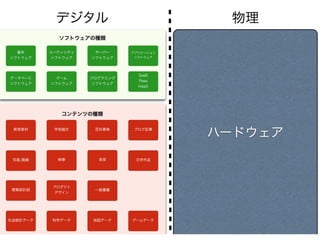 Hardware、 Open Contents など様々な領域にまたがる、 より幅広いオープンな知財「戦略」 が必要になる A wider open strategy of intellectual property is necessary
