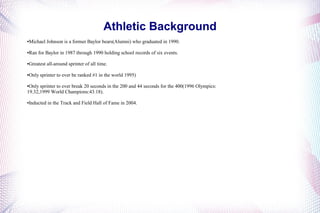 Michael Johnson is a former track star who graduated from Baylor University in 1990. He holds numerous school and world records as the greatest sprinter of all time, having won gold medals in the 200m and 400m races at both the World Championships and Olympics. Johnson achieved his success through hard work and sacrifice, drawing inspiration from athletes like Jesse Owens who overcame adversity.