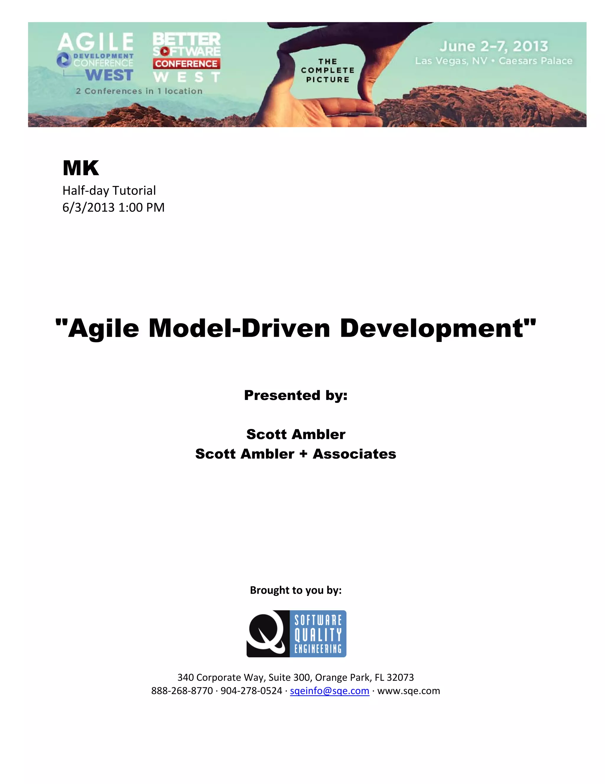 The document announces a half-day tutorial on Agile Model-Driven Development presented by Scott Ambler on June 3rd, 2013. The tutorial will cover topics such as Agile Modeling, Agile Model Driven Development, continuous modeling and documentation strategies, and scaling agile with modeling. The tutorial is being hosted by SQE and will provide attendees an opportunity to ask questions and participate in exercises.