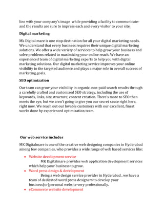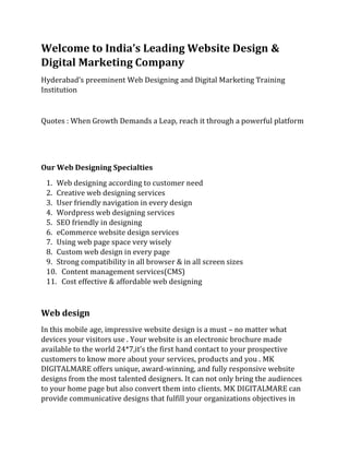 MK Digitalmare is a website design and digital marketing company based in Hyderabad, India that offers various services such as website design, development, SEO, and digital marketing. They provide user-friendly, responsive website designs and aim to increase clients' online visibility and marketing goals through strategic digital marketing services. They also offer website design and digital marketing training programs taught by experienced instructors.