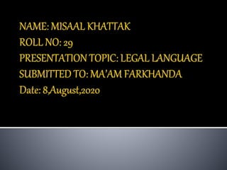 The document discusses the history and characteristics of legal language. It notes that legal language originated from Norman French and Ecclesiastic Latin influencing the development of English common law. While French was initially used in courts, English became predominantly used in legal settings by the 16th century. Legal language contains specialized vocabulary and complex sentence structures. It also discusses how the Miranda warning informs defendants of their rights to remain silent in a way they can understand depending on English language competency. Research into the linguistic analysis of legal texts encompasses documents from acts of parliament to wills and judgments. One of the earliest scholarly works analyzing the language of law was published in 1963.