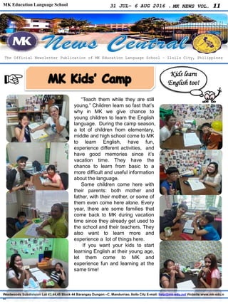 MK Education Language School hosts English language camps for children during summer vacations. The camps provide elementary, middle, and high school students the opportunity to learn English through both classroom instruction and recreational activities. Some children attend with their parents, while others come alone. Many families return each year because their children enjoy learning at MK and become accustomed to the teachers and school. The camps aim to teach English to young children while allowing them to have fun during their time off from school.