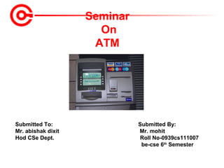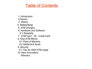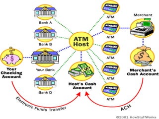 The document provides an overview of how ATMs work. It discusses the history of ATMs, beginning with the first one installed in 1967 in London. It describes the basic components and functions of an ATM, including how customers authenticate themselves using cards and PINs, how ATMs are connected to networks to allow withdrawals from other banks, and the basic process by which funds are withdrawn. It also covers reliability issues, security features, and innovations in ATM technology over time.