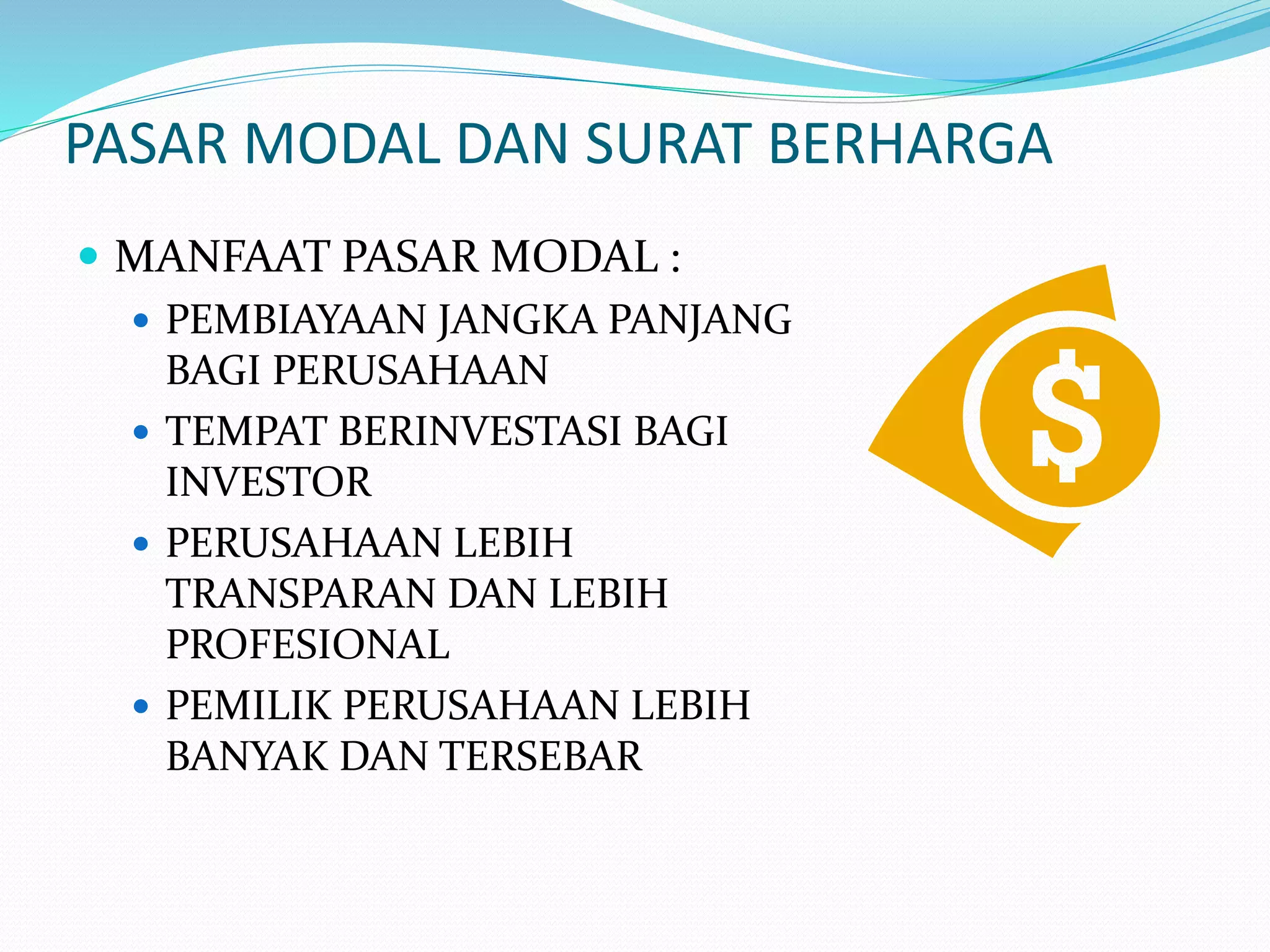 Dokumen tersebut membahas tentang pasar modal dan surat berharga, termasuk manfaat pasar modal seperti pembiayaan jangka panjang untuk perusahaan dan tempat berinvestasi bagi investor, serta jenis-jenis surat berharga seperti saham dan obligasi.