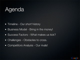 1) Google was founded in 1995 by Larry Page and Sergey Brin. It introduced its search engine in 1998 and later introduced AdWords in 2000 and AdSense in 2003 to monetize its services.