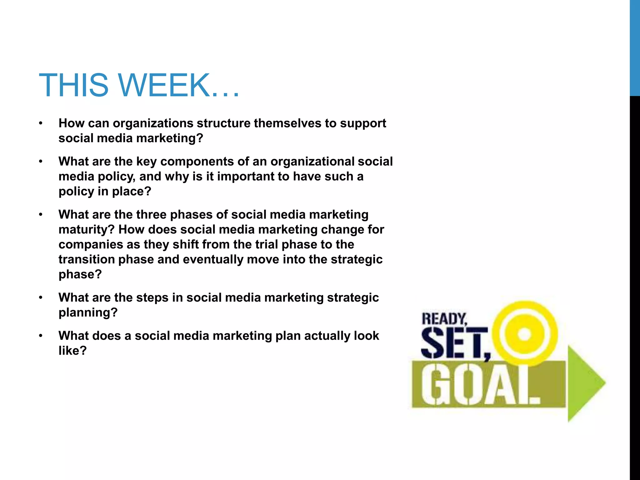 The document outlines the key components of developing a strategic social media marketing plan, including: