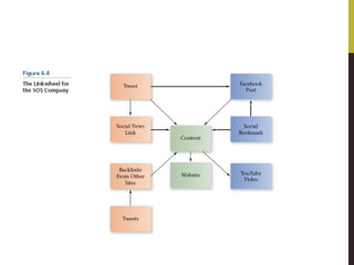 - Optimization strategies like SEO, SMO, on-site tactics like optimized titles and share tools, and off-site tactics like links from other sites.