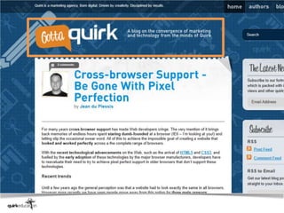 This document discusses best practices for web development and design. It emphasizes laying strong foundations by considering accessibility, usability, searchability and discoverability. Key recommendations include using standard conventions like bold text and bullet points, ensuring content is visible to search engines through metadata and alt tags, and testing sites thoroughly before launching. The document also covers opportunities and challenges of mobile development, such as small screens and navigation limitations on phones.