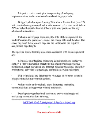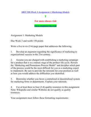 This document outlines three assignments for an MKT 506 marketing course. The first assignment asks students to argue the significance of marketing, review a marketing process model, and take a position on centralized vs decentralized marketing structures. The second assignment involves developing an advertising approach using social media. The third assignment asks students to argue the need for salespeople, consider a sales career, develop an ethical advertising policy, compare public relations, publicity and advertising, and speculate on the future role of publicity. All assignments require APA formatting and referencing multiple sources.