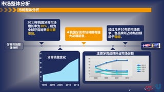 中国牙膏市场在2013年达到30%增长率,成为全球最主要市场,整体前景广阔,竞争逐渐稳定。高端牙膏市场成为竞争焦点,消费者对美白与产品效果需求增加,而电商平台如天猫和聚美优品的流量和用户粘性表现优异,为品牌推广提供了良好平台。营销策略针对年轻女性,通过活动增加用户参与度,提升品牌认知,促进销量增长。