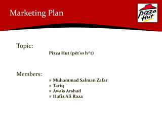 Pizza Hut is a wholly owned subsidiary of Yum! Brands founded in 1958 in Wichita, Kansas. It has over 300,000 employees and 34,000 outlets worldwide including 38 outlets across 9 cities in Pakistan. Pizza Hut's marketing strategy focuses on targeting younger generations and families through quality products, competitive prices, and promotions. The marketing mix includes variety of pizza types, discounts, advertising, and sales through dine-in, takeaway, and delivery channels. Key competitors include Domino's Pizza, KFC, and local Pakistani brands.