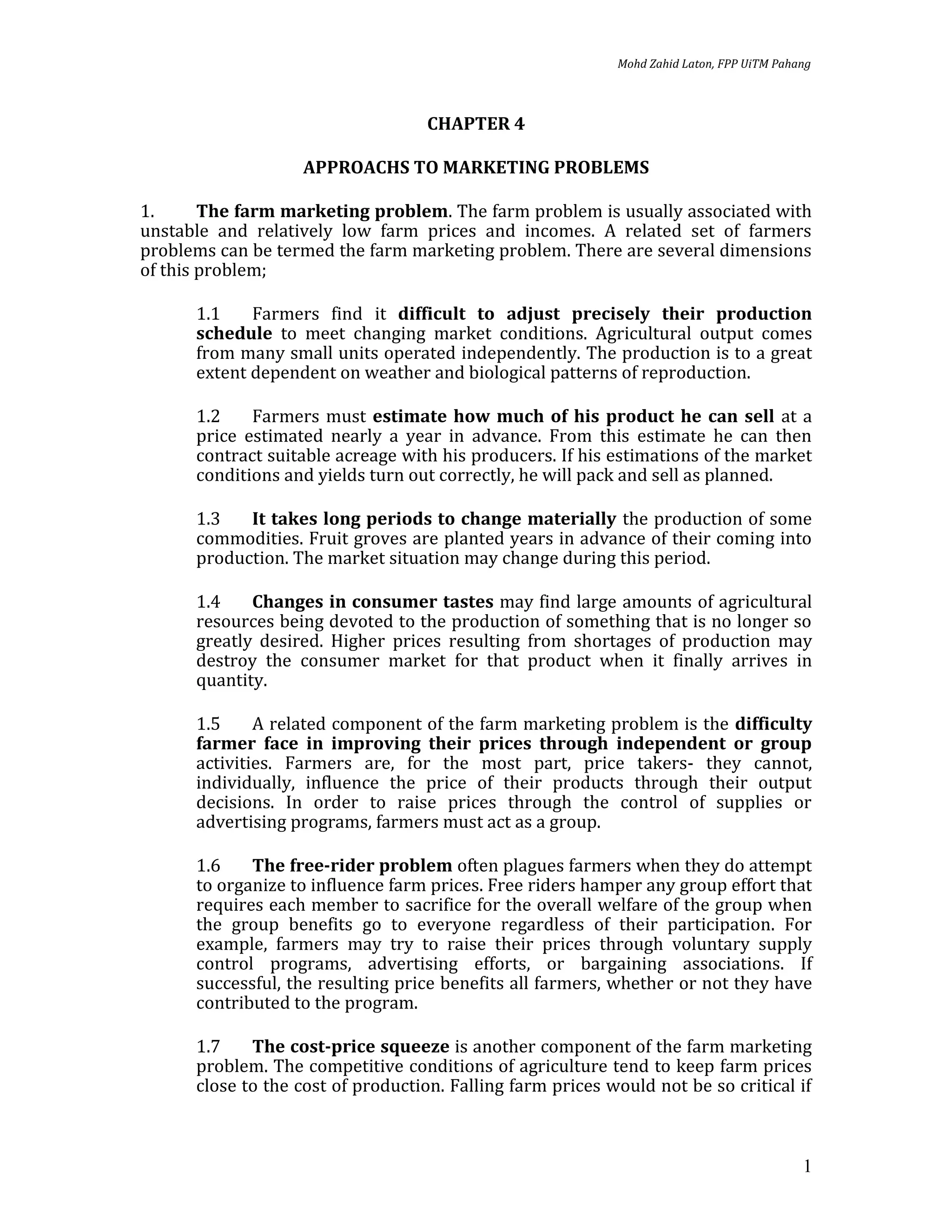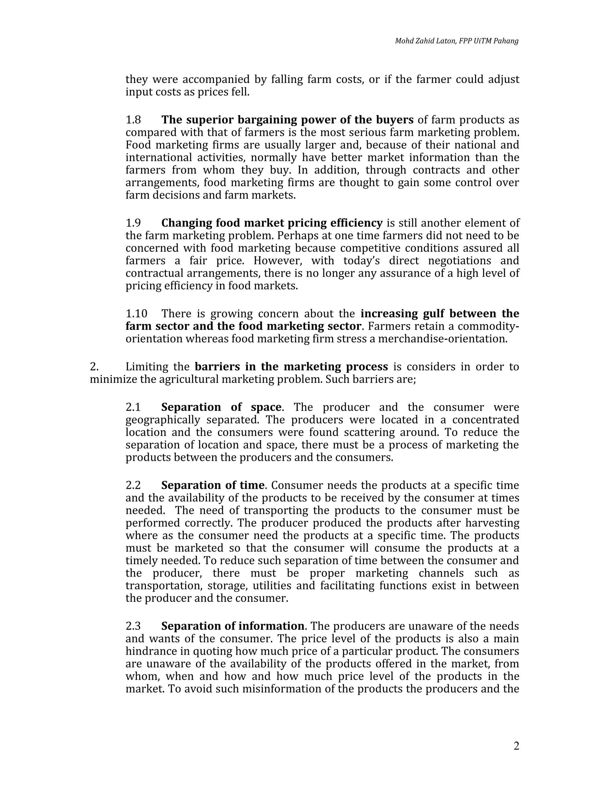 This document discusses approaches to agricultural marketing problems. It identifies several dimensions of the farm marketing problem including difficulties adjusting production to meet changing markets and estimating future prices. It also discusses barriers in the marketing process like separation of location, time and information between producers and consumers. The document then covers functional approaches to marketing like exchange, physical and facilitating functions. It defines concepts like concentration, equalization and dispersion in the exchange process as well as factors enabling decentralized markets. Storage is discussed as interrelated with transportation, processing and risk bearing in food marketing systems.