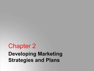 This document provides an overview of key concepts in developing marketing strategies and plans. It discusses Michael Porter's value chain as a tool for identifying ways to create customer value. It also covers core competencies, strategic business units, the Ansoff matrix for assessing growth opportunities, SWOT analysis, goal formulation, and Porter's generic strategies. Finally, it outlines the typical contents of a marketing plan, including sections for situation analysis, marketing strategy, tactics, financial projections, and implementation controls.