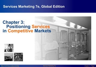 This chapter discusses positioning services in competitive markets. It covers focusing strategies like being market focused, service focused, or fully focused. Market segmentation and developing the right service concept for segments is also discussed. Important concepts include determining attributes that distinguish services, establishing service levels, and developing an effective positioning strategy. Positioning maps are presented as a tool to analyze competitive strategies by visually mapping competitor positions based on attributes. The examples demonstrate how positioning maps can show changes in competitive landscapes over time.