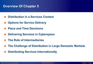 This chapter discusses service distribution and delivery channels. It covers options for delivering services through physical locations or electronic channels. Key topics include the role of intermediaries in distributing services, challenges of large domestic and international markets, and how technology influences service delivery. The chapter compares distributing core versus supplementary services and examines place and time decisions for optimal service access. Overall it provides an overview of physical and electronic distribution strategies for marketing services globally.