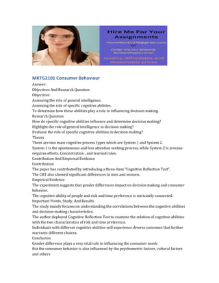 This document summarizes a study on how cognitive abilities influence decision making. The study assessed the role of general and specific cognitive abilities and used the Cognitive Reflection Test to examine the relationship between cognitive abilities and risk/time preferences. The results showed gender differences in cognitive abilities that impact decision making and consumer behavior. Individuals with different cognitive skills make distinct choices based on diverse outcomes. Future research could further explore how sex differences and specific cognitive processes affect consumer attitudes and behavior.
