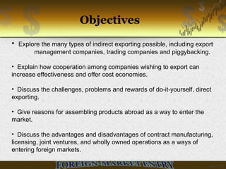 This document discusses various methods for companies to enter foreign markets, including indirect exporting, direct exporting, contract manufacturing, licensing, joint ventures, and wholly owned foreign operations. It provides details on the objectives, decision criteria, advantages, and disadvantages of each method. Overall, it aims to help companies choose the best entry method based on their goals, resources, and risk tolerance for international expansion.