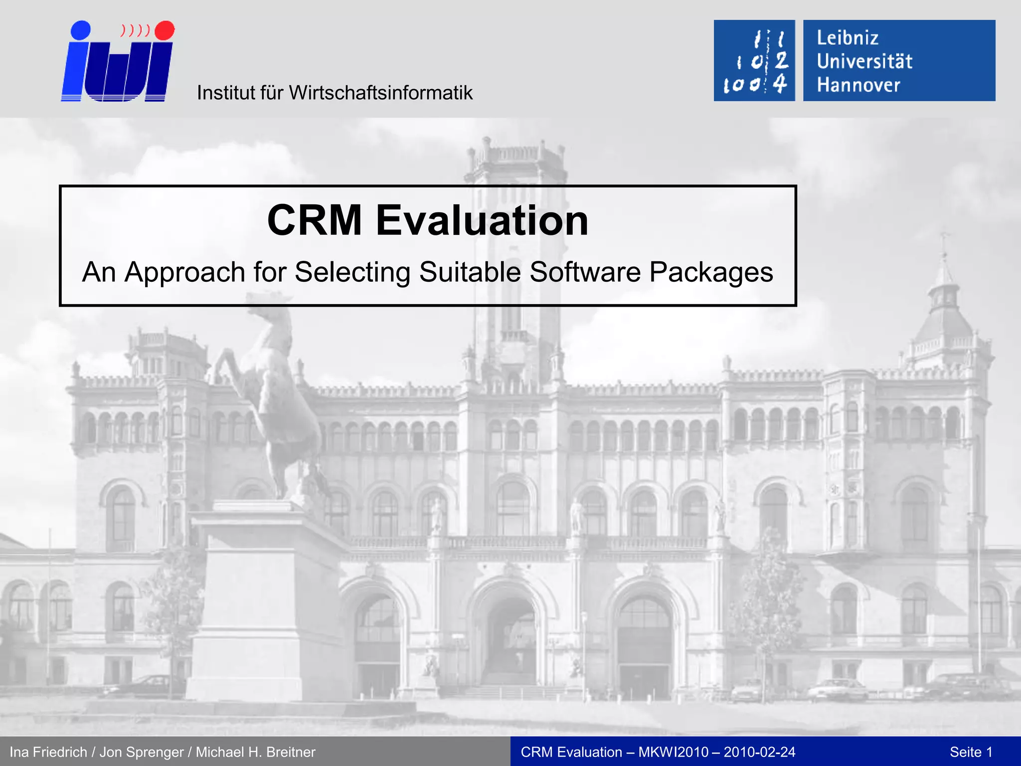 This document presents an approach for evaluating and selecting suitable CRM (customer relationship management) software packages. It introduces CRM and the need for evaluation. The methodology assesses published papers to develop criteria and an evaluation technique. The approach involves defining strategy and requirements, analyzing the CRM software market, evaluating packages based on functional criteria weighted using AHP (analytic hierarchy process). Limitations and future work are discussed, such as validating the approach by comparing it to completed CRM projects.