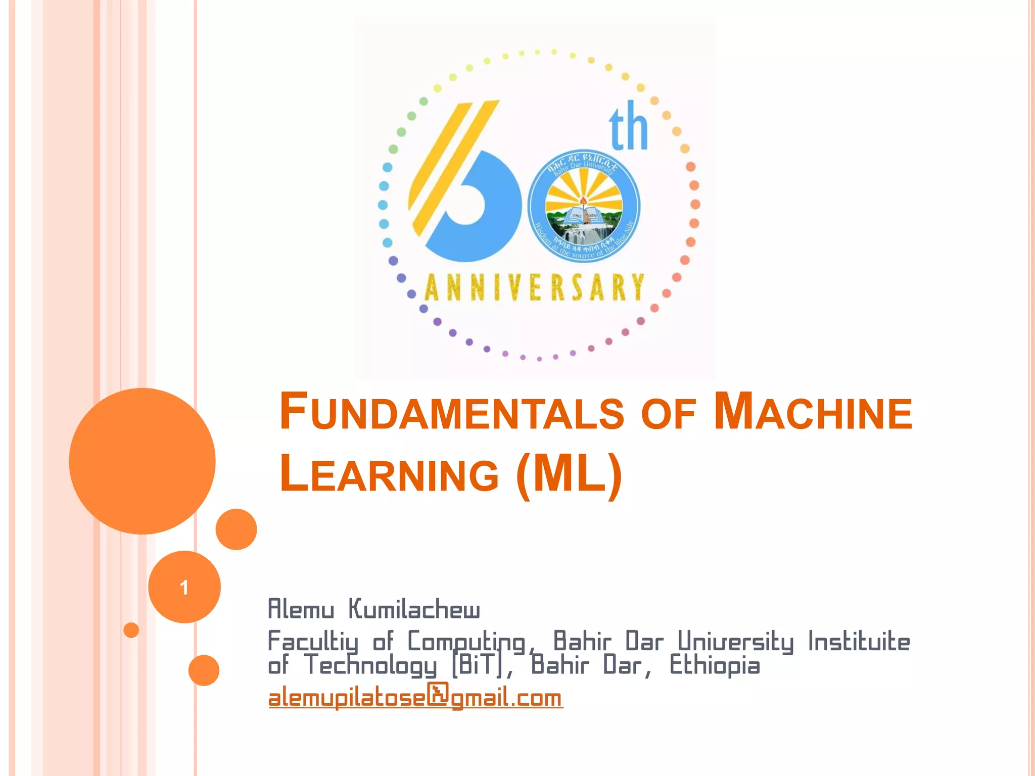 Machine learning fundamentals and concepts are discussed in the document. It begins with an introduction to machine learning and discusses key concepts like learning, the machine learning process, and components of learning like data storage, abstraction, generalization and evaluation. Examples of machine learning applications and a summary of learning concepts are also provided.
