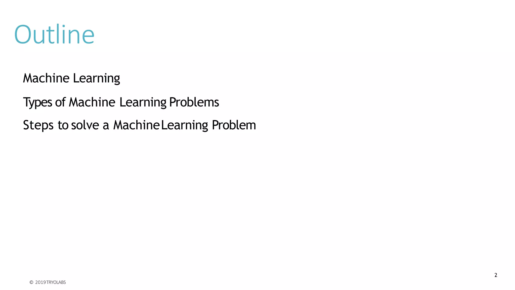 Machine learning involves using data to answer questions and make predictions. There are three main types of machine learning problems: supervised learning which involves predicting outputs given labeled examples; unsupervised learning which finds hidden patterns in unlabeled data; and reinforcement learning where an agent learns through trial-and-error interactions with an environment. To solve a machine learning problem typically involves five steps: gathering and preprocessing data, engineering features, selecting and training an algorithm, and using the trained model to make predictions.