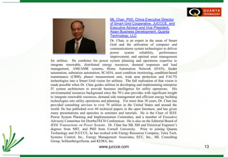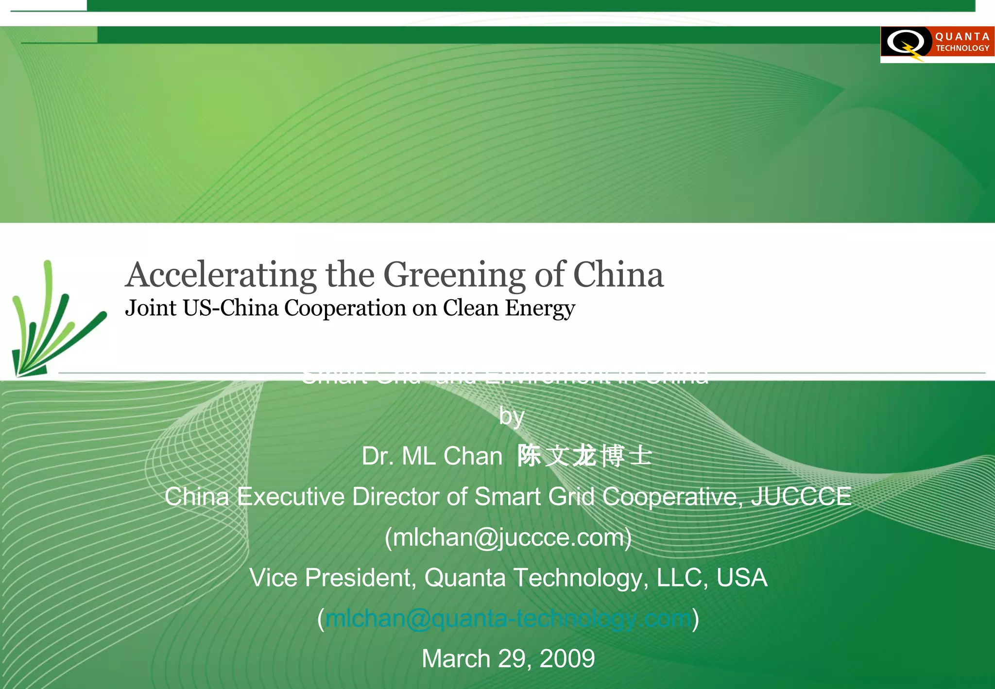 The document summarizes a presentation about accelerating green energy development in China through smart grid technology and US-China cooperation. It discusses China's growing electricity needs and transition to renewable and nuclear energy. Smart grid applications could significantly reduce carbon emissions by improving efficiency, integrating renewable energy, and enabling electric vehicles. Joint US-China programs through non-profits like JUCCCE provide expertise and technologies to support China's green energy goals.