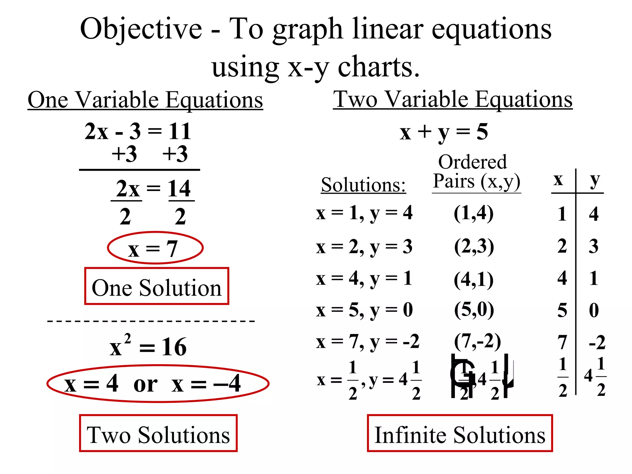 The document discusses graphing linear equations using x-y charts. It provides examples of solving single-variable and two-variable linear equations for x and y. Specific examples shown include finding the solution sets for various equations and determining if given points satisfy particular linear equations. Charts are completed and equations are graphed.
