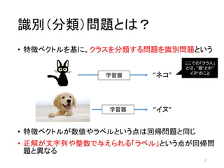 識別(分類)問題とは? • 特徴ベクトルを基に、クラスを分類する問題を識別問題という 2 • 特徴ベクトルが数値やラベルという点は回帰問題と同じ •
