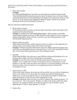 This document provides a guide to basic MLA formatting and citation styles. It covers the general formatting of a document, including font, spacing, margins, and page headers. It also details how to format in-text citations for various source types like books, websites, poems, and more. The guide concludes with instructions for creating a Works Cited page that alphabetically lists all sources cited. Proper citation and avoiding plagiarism is emphasized. MLA style aims to give academic writing a professional look and credibly document sources.