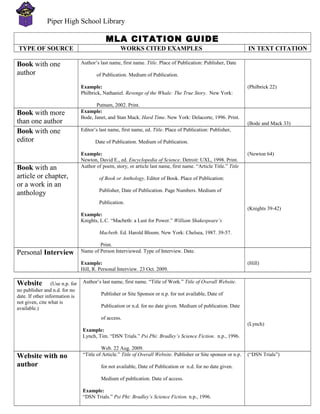 This document provides a guide for citing sources in MLA format, including books, websites, personal interviews, and images. It lists the core elements that should be included for each type of source in both the Works Cited list and in-text citations. Examples are provided for citing various types of books, as well as websites, databases, and images from the web. Basic guidelines are given for how to handle missing information and citing sources in a presentation.