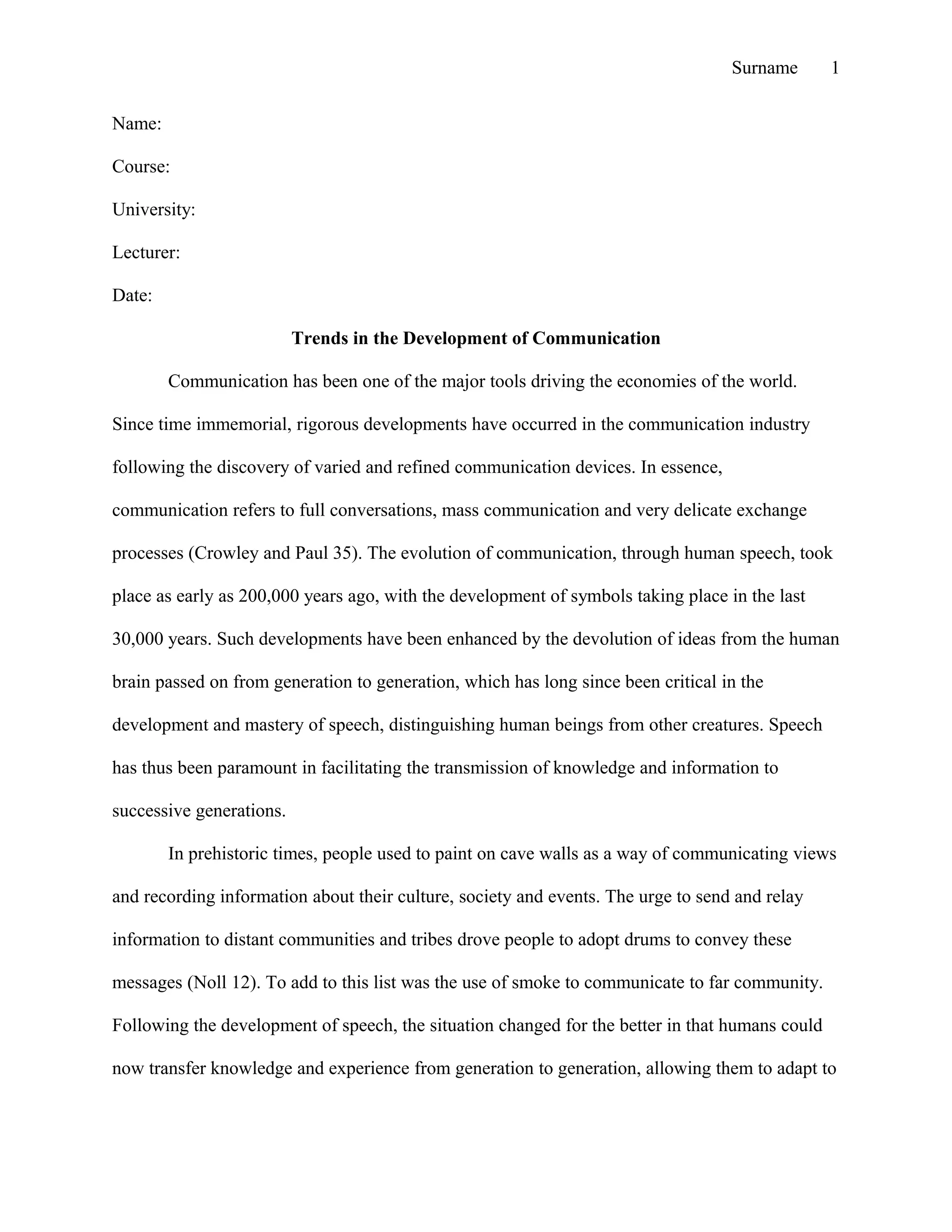 Communication has evolved significantly over time, from early symbolic forms like cave paintings to modern digital technologies. Early humans developed speech around 200,000 years ago and began using symbols like pictograms around 10,000 BC to convey more complex concepts. Writing systems then emerged, beginning as early as the 4th millennium BC with clay tokens and progressing to alphabets by around 2000 BC. The need for more efficient long-distance communication drove technological advances like the telegraph in the 18th century, telephone in 1876, radio in the early 20th century, and the development of the internet in the late 20th century using protocols like TCP/IP. Communication continues to change with technological innovation and evolving human needs.