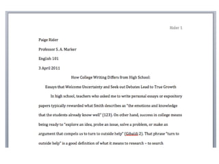 The document provides guidelines for citing sources in MLA format within the text of a paper (in-text citations). It lists examples of in-text citations for print resources with authors, including citing a specific page, and for electronic resources with authors, including citing an article title. The document also provides brief guidelines for the structure and content of a research paper in MLA format, including an introduction, body with citations and one counter-argument paragraph, conclusion, works cited page, and MLA formatting.