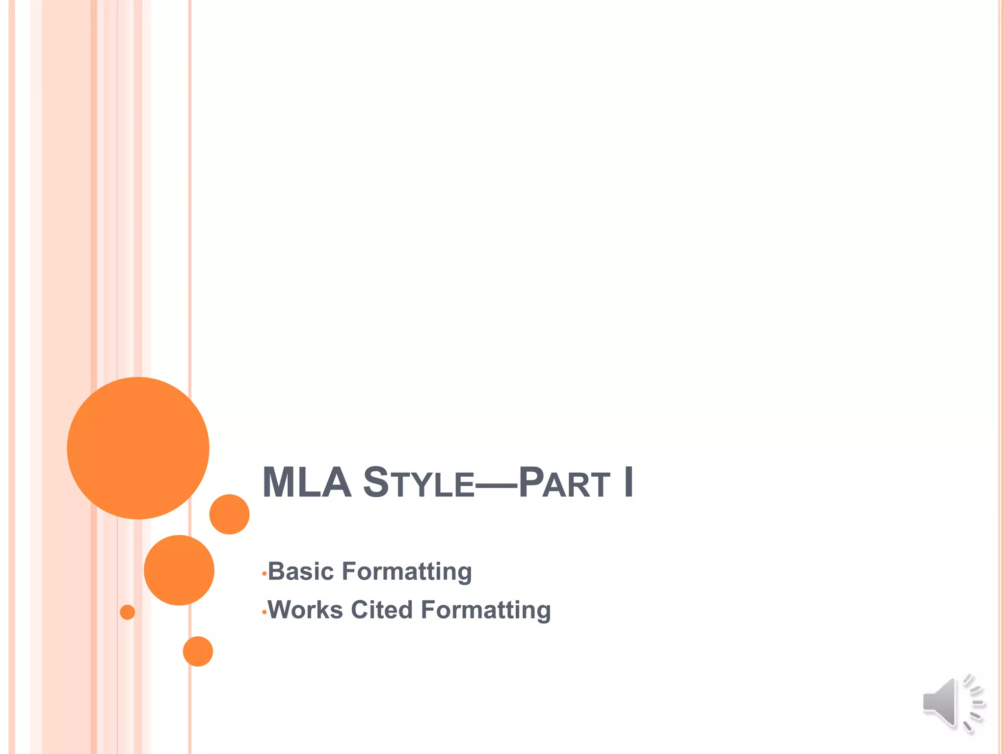 This document provides instructions for formatting a paper and works cited list using MLA style. It discusses setting one-inch margins and a 12-point Times New Roman font. The header should include the author's name, instructor, course, and date. The works cited list appears on a separate page, with entries alphabetized, double-spaced, and using a hanging indent. Different source types like books, articles, and websites each have a specific citation format that must be followed precisely. Students are advised to consult additional references for any citation questions.