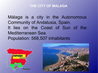 Málaga is a city on the southern coast of Spain known for its mild climate and historical importance. It was founded by Phoenicians over 2,700 years ago and flourished under Islamic rule. Today, Málaga has over 500,000 residents and is a center of industry, tourism, and culture, most notably as the birthplace of artist Pablo Picasso. The city hosts many festivals throughout the year, most notably Holy Week, Saint John's Eve with bonfires on the beach, and the maritime procession of the Virgin of Carmen in July. Top attractions for visitors include the historic Alcazaba fortress, La Manquita Cathedral, the working port, and the Museo Picasso dedicated to
