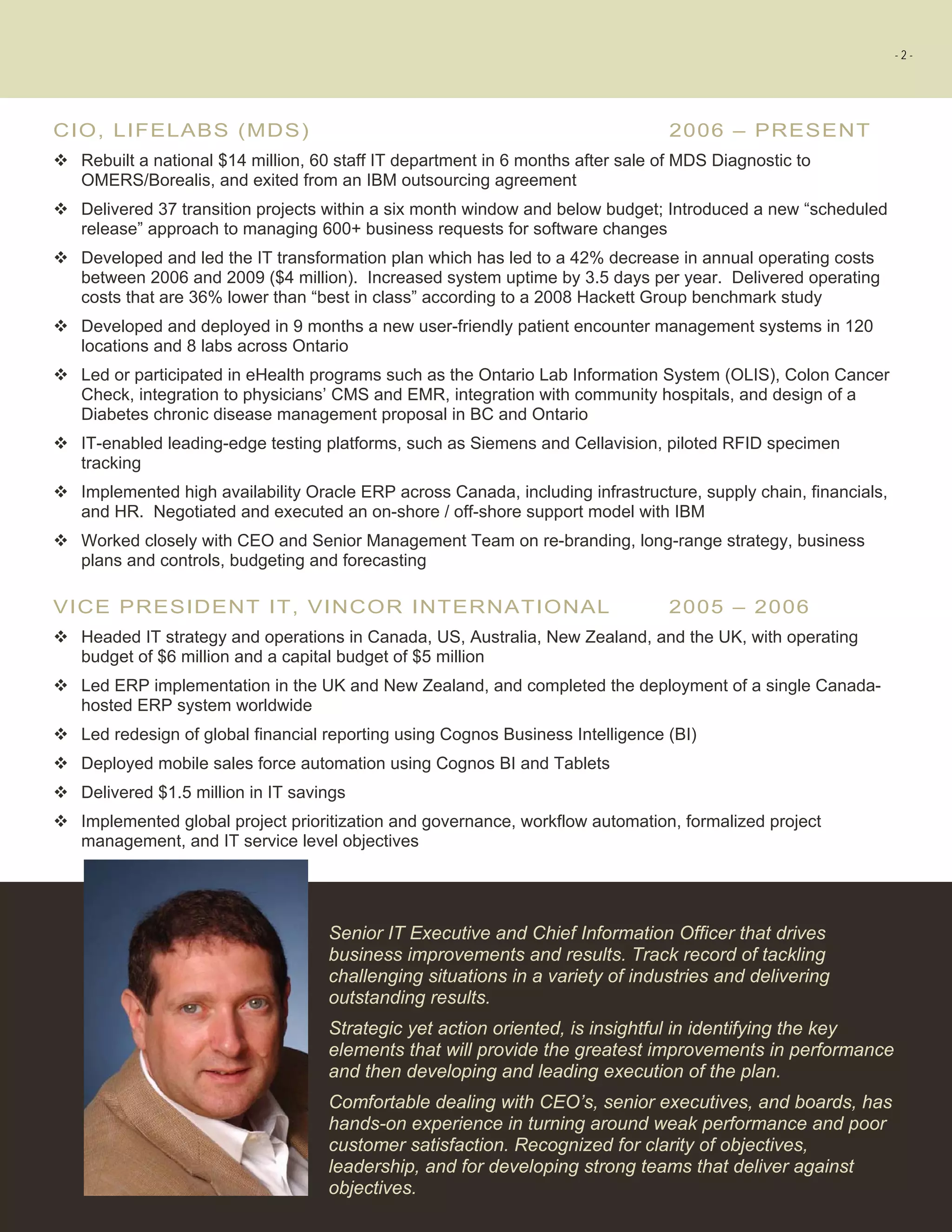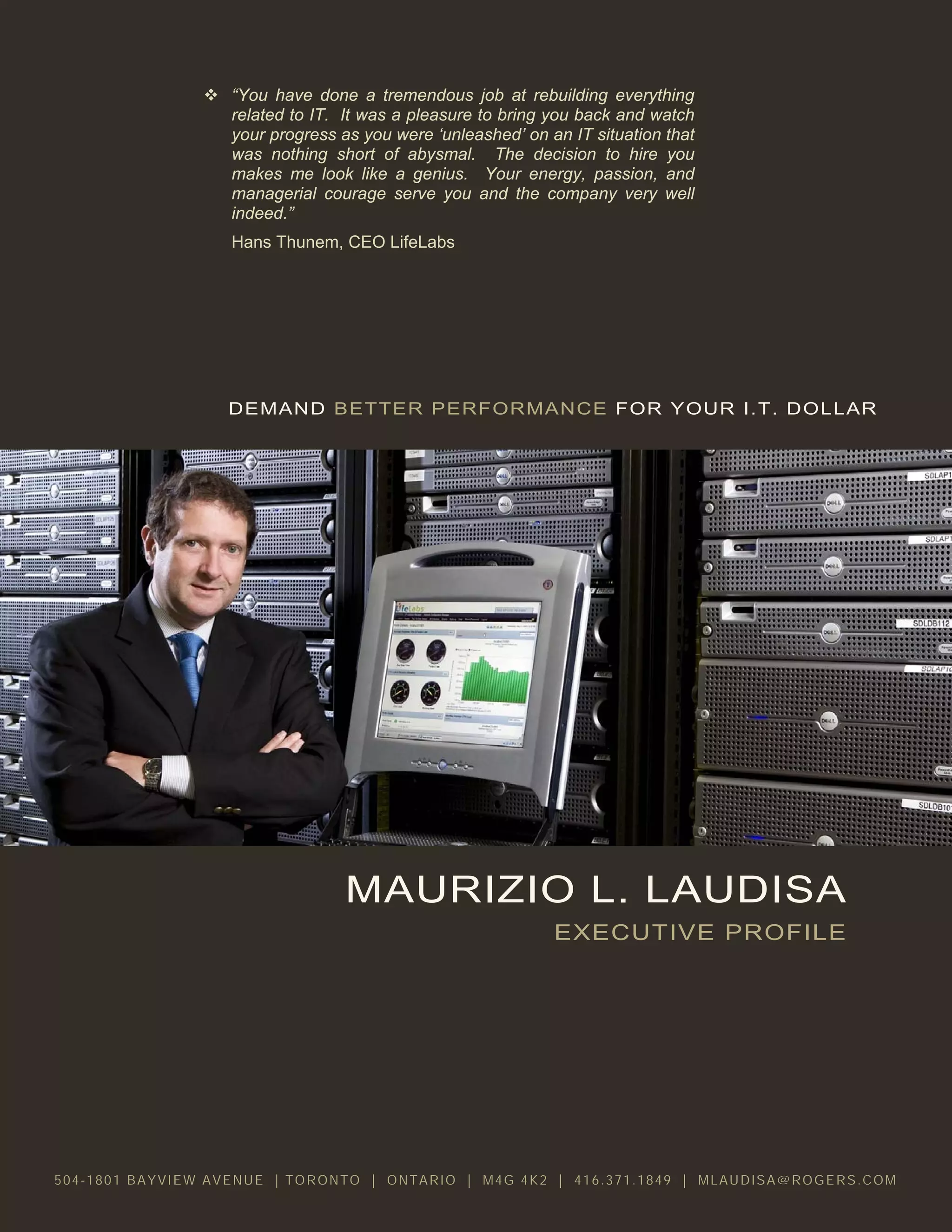 The document is a summary of Maurizio L. Laudisa's career and accomplishments as an IT executive. It highlights that as CIO of LifeLabs, he rebuilt their IT department in 6 months, delivered projects under budget, and decreased annual operating costs by 42% while increasing system uptime. A 2008 benchmark study found LifeLabs' IT costs were 36% lower than best-in-class peers with lower costs per user. Customer feedback praised the improved service and support delivered by the IT department under his leadership.
