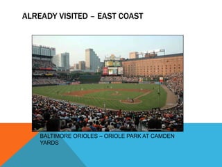 The document lists several Major League Baseball teams and their home stadiums that the author has already visited on the East Coast, Midwest, and West Coast. It also notes upcoming visits to see the Pittsburgh Pirates at PNC Park, the Washington Nationals at National Park, the Atlanta Braves at Turner Field, and the Boston Red Sox at Fenway Park.